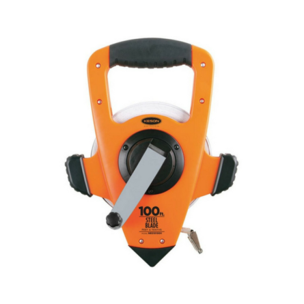 Ruban à mesurer à rembobinage rapide 100’/30m en acier recouvert de nylon avec attache double crochet et point zéro à l’extrémité. Gradué en pi, po, 1/8, mm, cm et m.