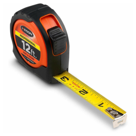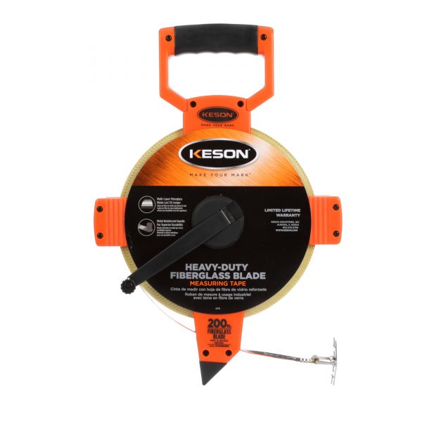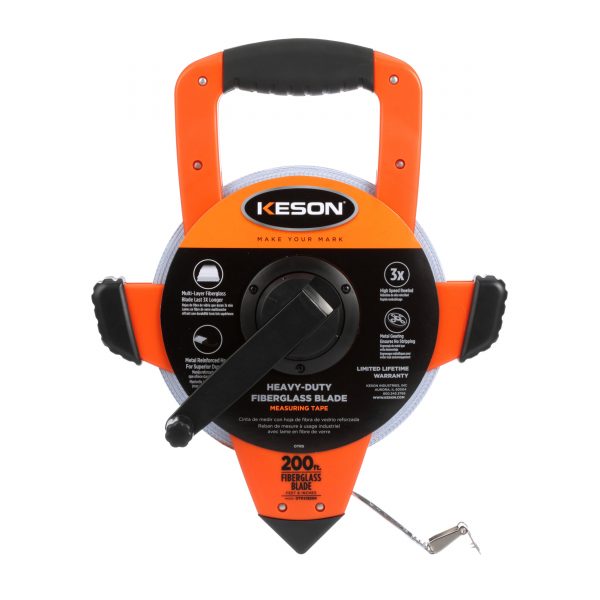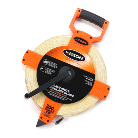 Ruban à mesurer Keson en acier recouvert de fibre à rembobinage rapide. Lecture en pi, po, 1/8, mm, cm et m.